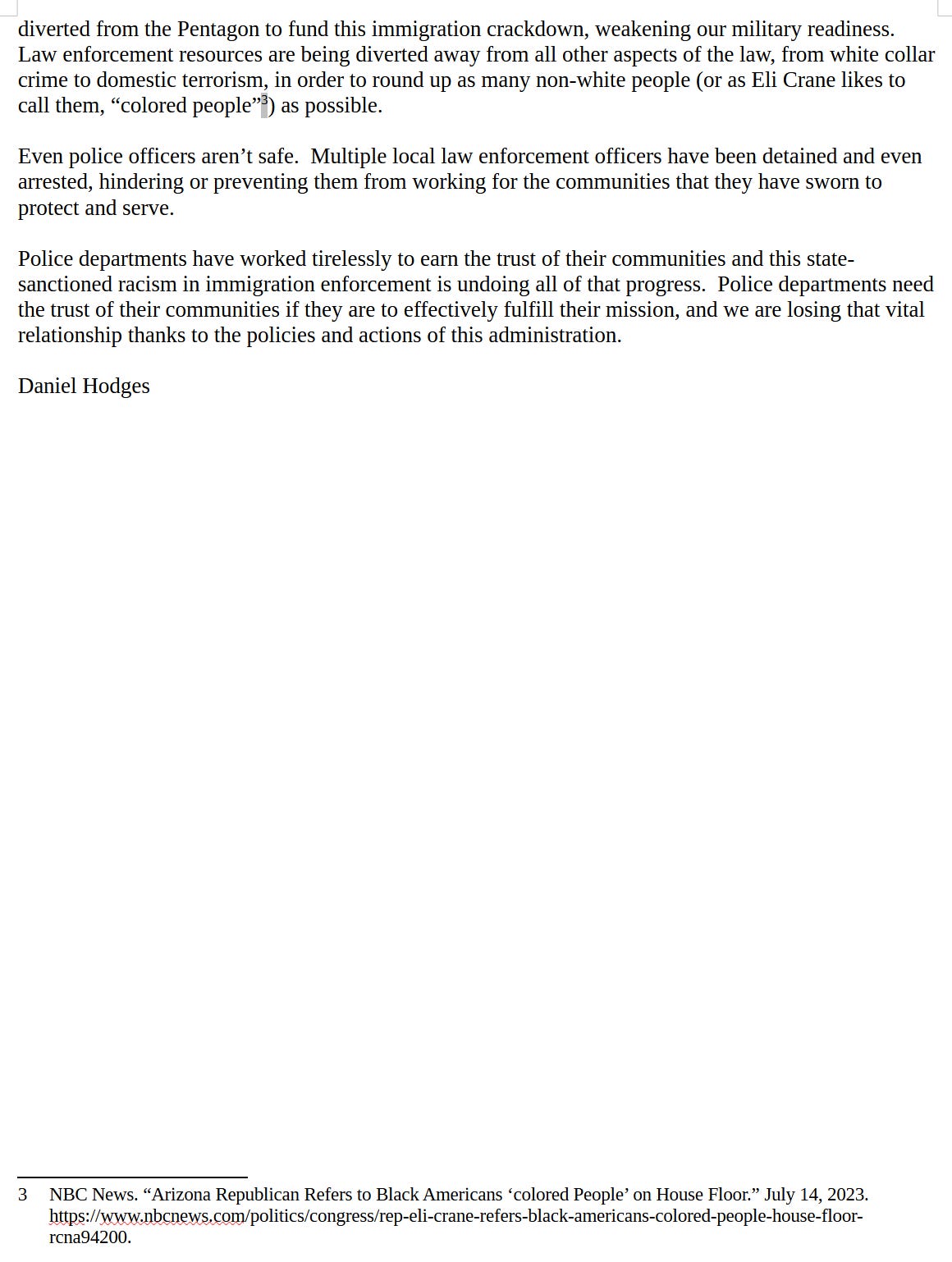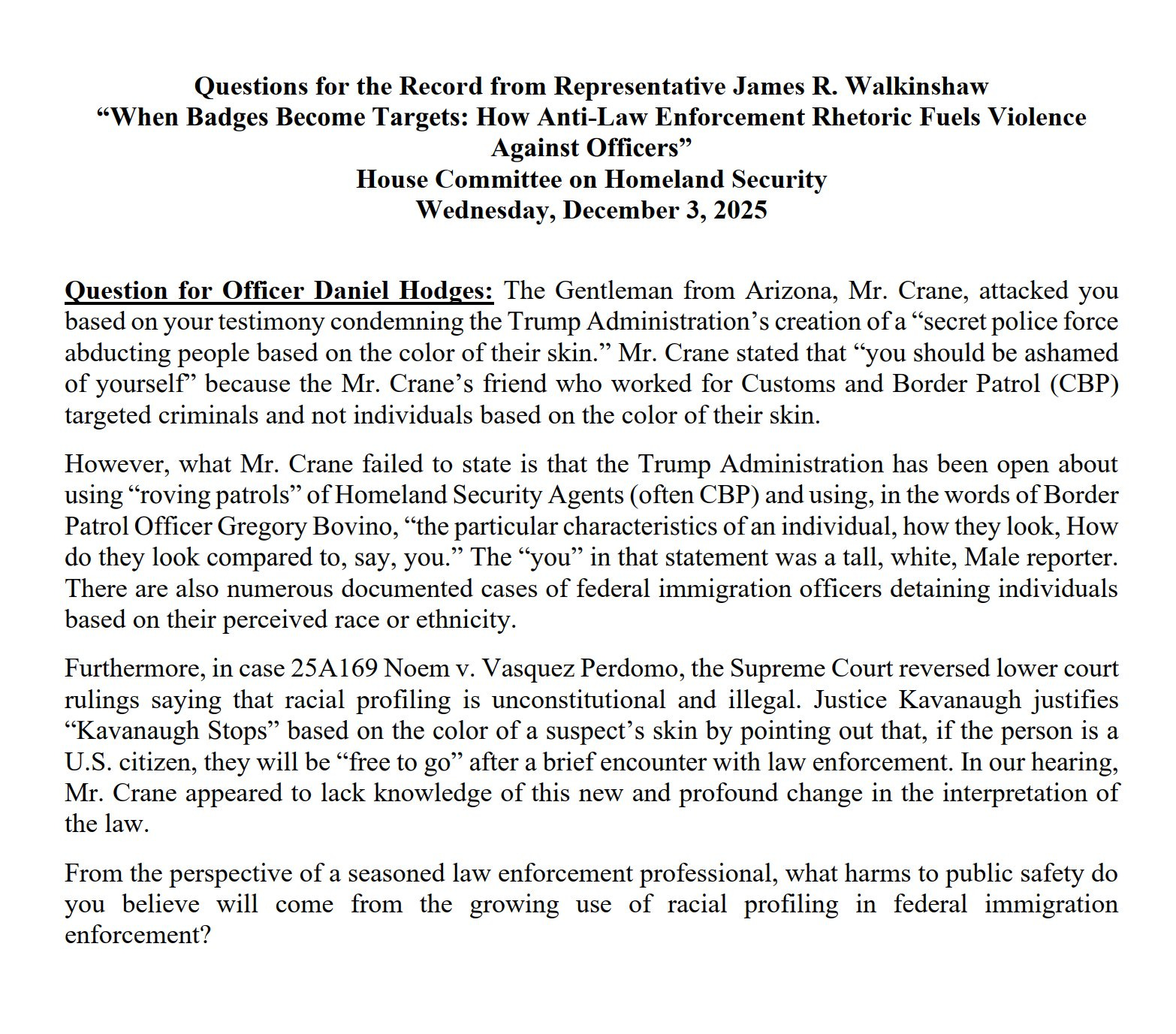 I spoke as a witness at the House Committee on Homeland Security's hearing on threats to law enforcement on 12/3/25. I received an additional question in writing from Rep. Walkinshaw after the conclusion of the hearing. You can find the question attached and my response attached.